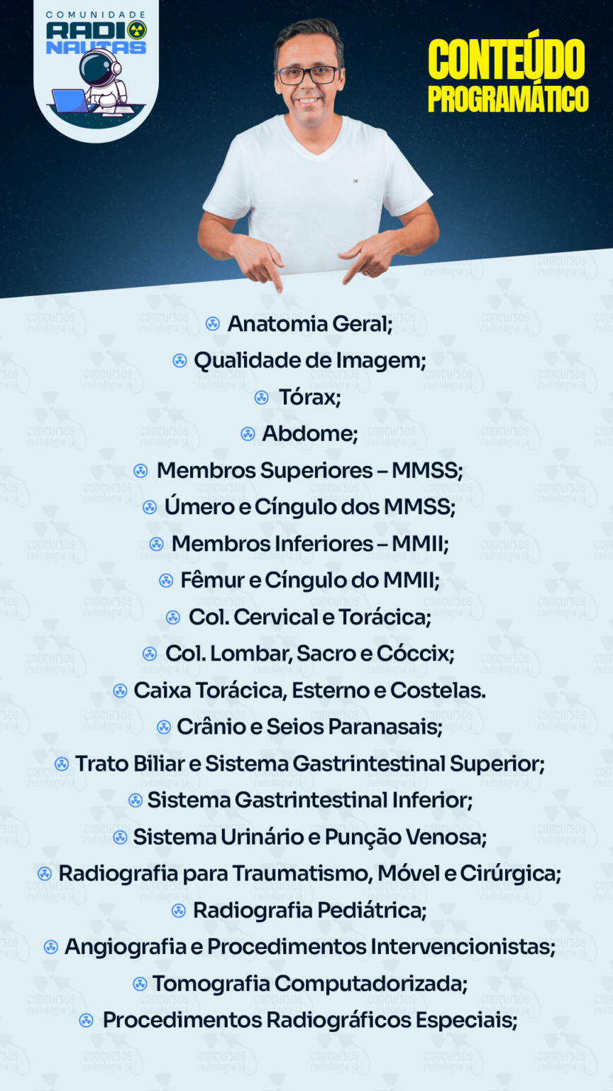É indicado pra Técnicos, Tecnólogos ou Estudantes de Radiologia que Querem Aprofundar seus conhecimentos. Ele abrange conteúdo do Básico ao Avançado.
